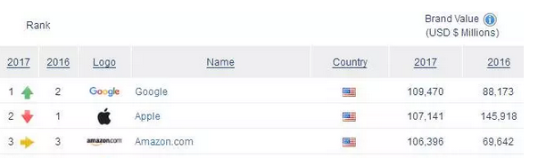 2017年全世界知名品牌500强中的排名也早已出炉,这一份由品牌知名度鉴定组织“Brand Frinance”发布的全世界知名品牌排行,亚马逊稳居第三位,知名品牌总额1064亿。